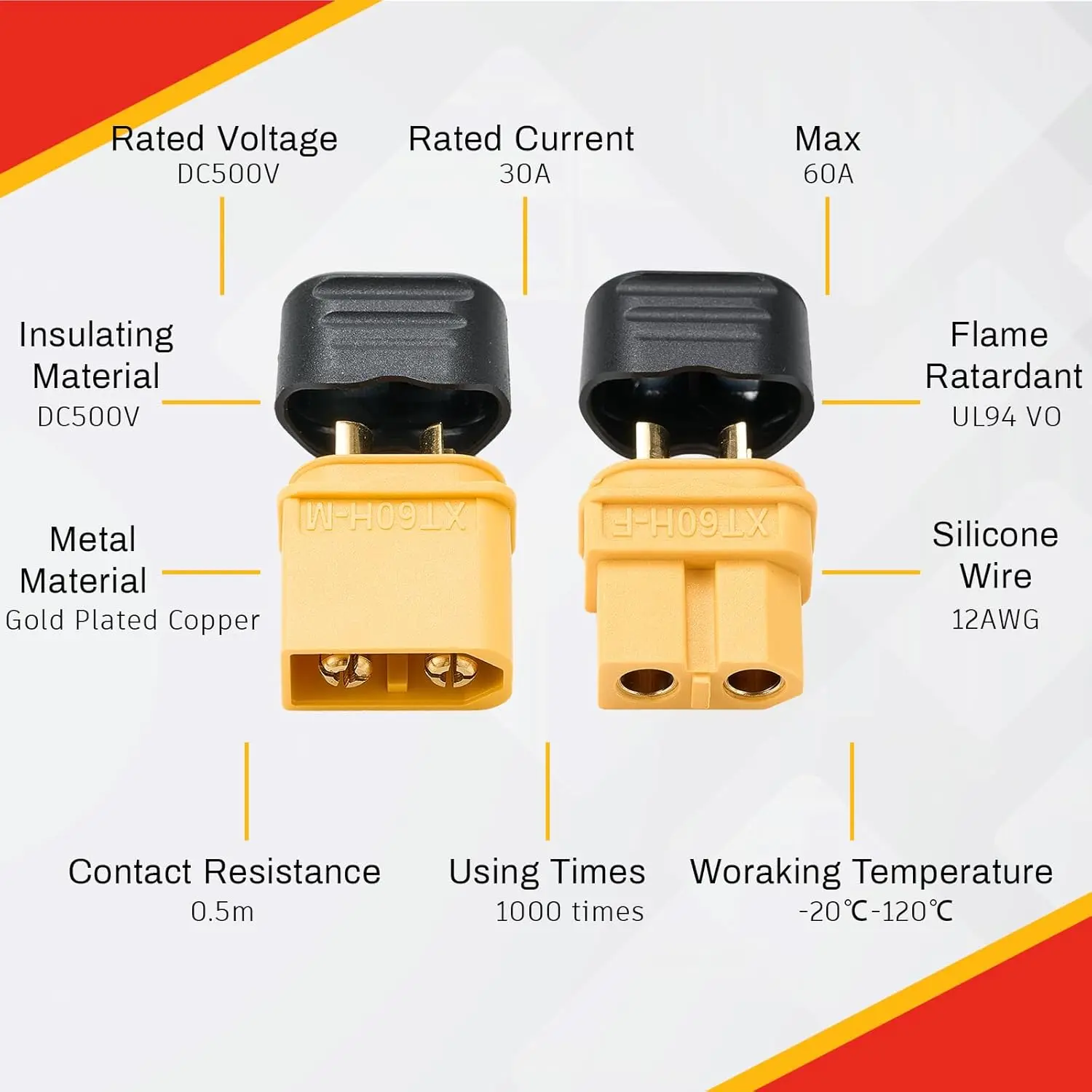 • HIGH-QUALITY: XT60H connectors are made of high-temperature nylon material with gold-plated copper internal components.